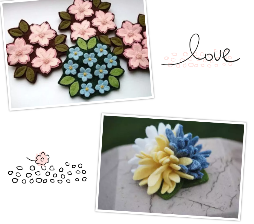 通过不同的颜色搭配、DIY手法将一块块不起眼的毛毡布制成形态各异的小花朵,不仅可以作为日常装饰,还能运用在服装、饰品中,成为亮眼的时尚潮流元素。